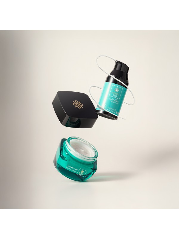 Formuła kremu bogata w organiczną oliwę z oliwek, ekstrakt ze spiruliny i zaawansowane składniki aktywne działa wielokierunkowo – poprawia jędrność, redukuje zmarszczki i przywraca cerze promienny wygląd.