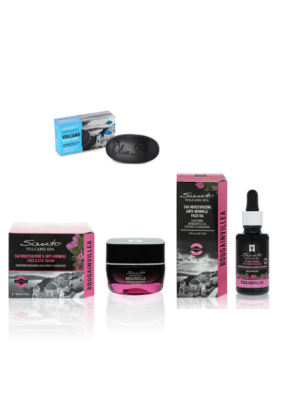 Zestaw Bougainvillea Santo Volcano Spa to wyjątkowy duet kosmetyków do codziennej pielęgnacji twarzy, szyi i dekoltu. Stworzony na bazie wody wulkanicznej, ekstraktu z rośliny Bougainvillea i certyfikowanej oliwy z oliwek, zapewnia intensywne nawilżenie, regenerację i promienny wygląd skóry.