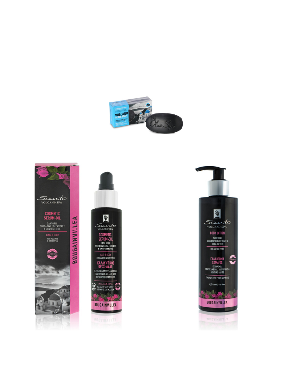 Zestaw Bougainvillea Santo Volcano Spa to idealny duet dla osób, które chcą zapewnić skórze i włosom intensywne nawilżenie, odżywienie i rewitalizację. Produkty zawierają organiczne składniki aktywne, w tym olej arganowy, olej winogronowy, wyciąg z korzenia marchwi oraz certyfikowaną oliwę z oliwek. Skóra staje się miękka, gładka, odżywiona i subtelnie rozświetlona, a włosy – elastyczne i pełne blasku.