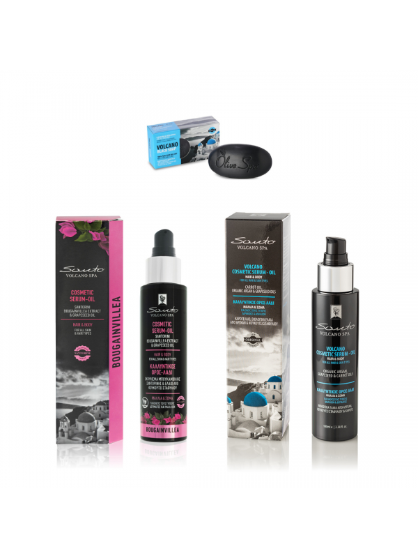 Zestaw łączy w sobie dwa luksusowe oleje-serum – klasyczny Santo Volcano Spa oraz wyjątkowy Bougainvillea, które intensywnie nawilżają, regenerują i odżywiają skórę, przywracając jej miękkość i blask. Ich lekka, aksamitna konsystencja szybko się wchłania, pozostawiając delikatny zapach, bez uczucia tłustości.
